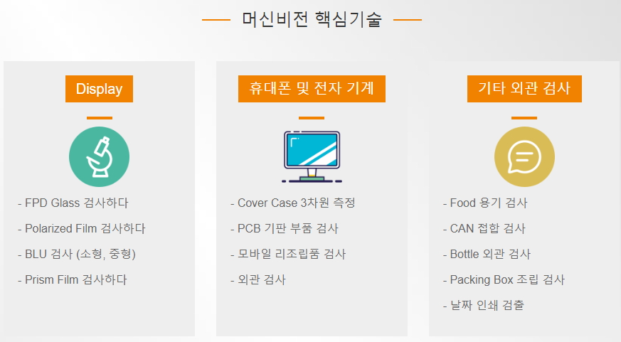 - 넥스트아이의 주요 제품은 BLU 검사장비, 편광필름 검사장비, 유리모서리 깨짐 검사장비(GECD)로 LCD 디스플레이 제품, 부품의 제조공정에서 검수장비로 활용되고 있습니다.
