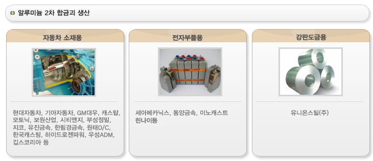 - 알루미늄 합금 산업은 대표적인 재활용 산업으로 재용해를 통해 생산된 합금 제품은 대부분 자동차 부품 소재용으로 사용되고 있습니다.