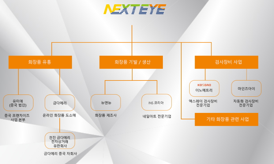 - 넥스트아이의 사업은 크게 세 가지로 나뉩니다. 화장품 유통, 화장품 개발/생산, 검사장비 사업입니다.