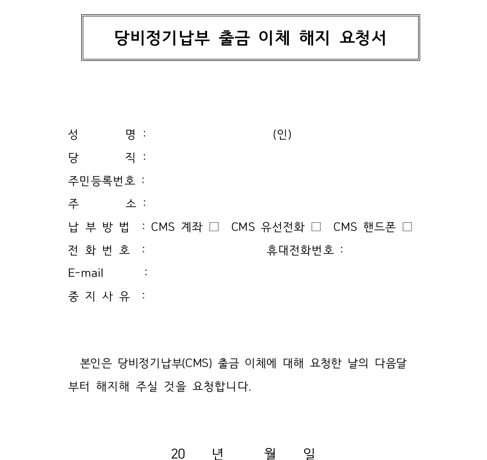 탈당만 한다고 되는것은 아닙니다. 그동안 정치 후원금 개념으로 납부하거나 대선후보 경선의 투표권을 위해서 당비를 자동납부하셨던 분들도 많이 계실텐데요 국민의힘 탈당만 한다고 해서 당비 납부가 자동으로 정지되는 것은 아닙니다. 당비정기납부 출금 이체 해지 요청서를 준비해서 탈당 신청서와 함께 팩스로 제출해야 합니다.
