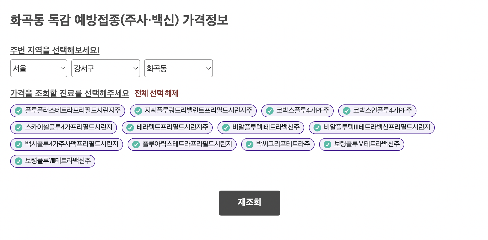 주변지역과 가격을 선택하고 선호하는 백신이 있다면 아래 백신 이름을 선택하고 조회를 누릅니다.