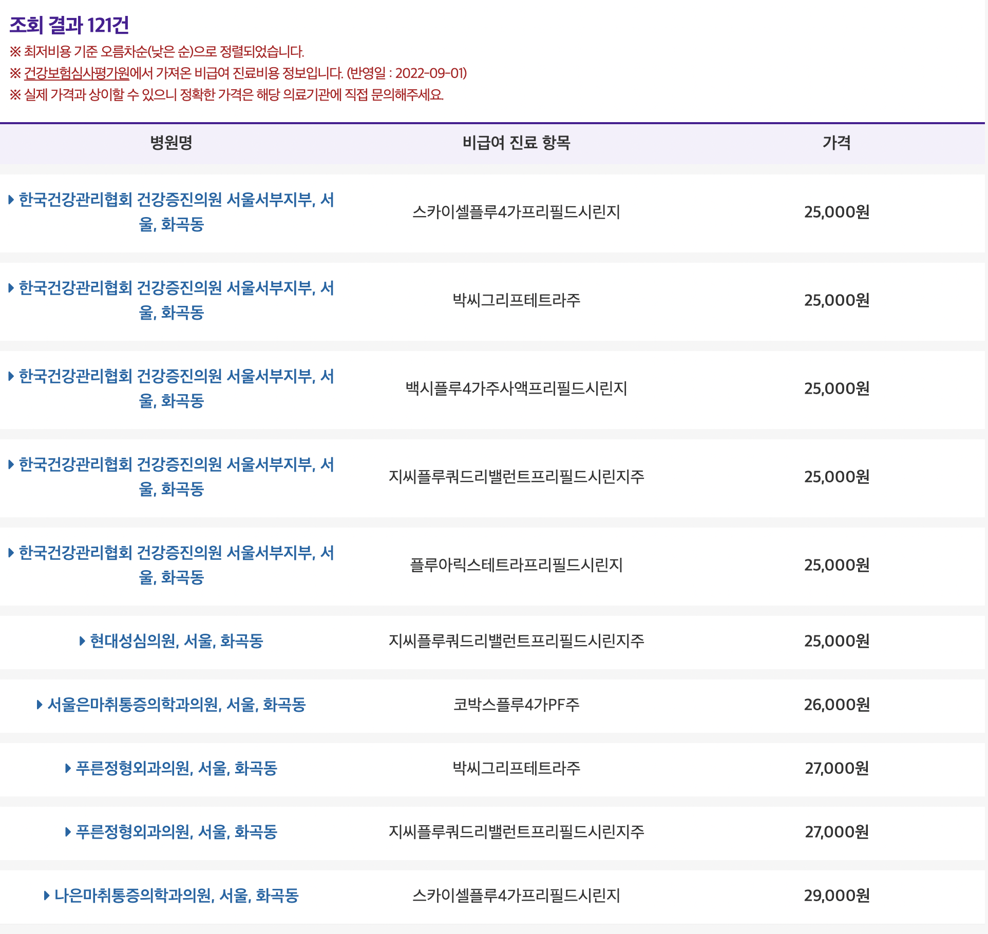 위와 같이 독감예방접종 가격비교 결과가 나오는데요 저렴한 순서대로 나와있어 보기가 편합니다.