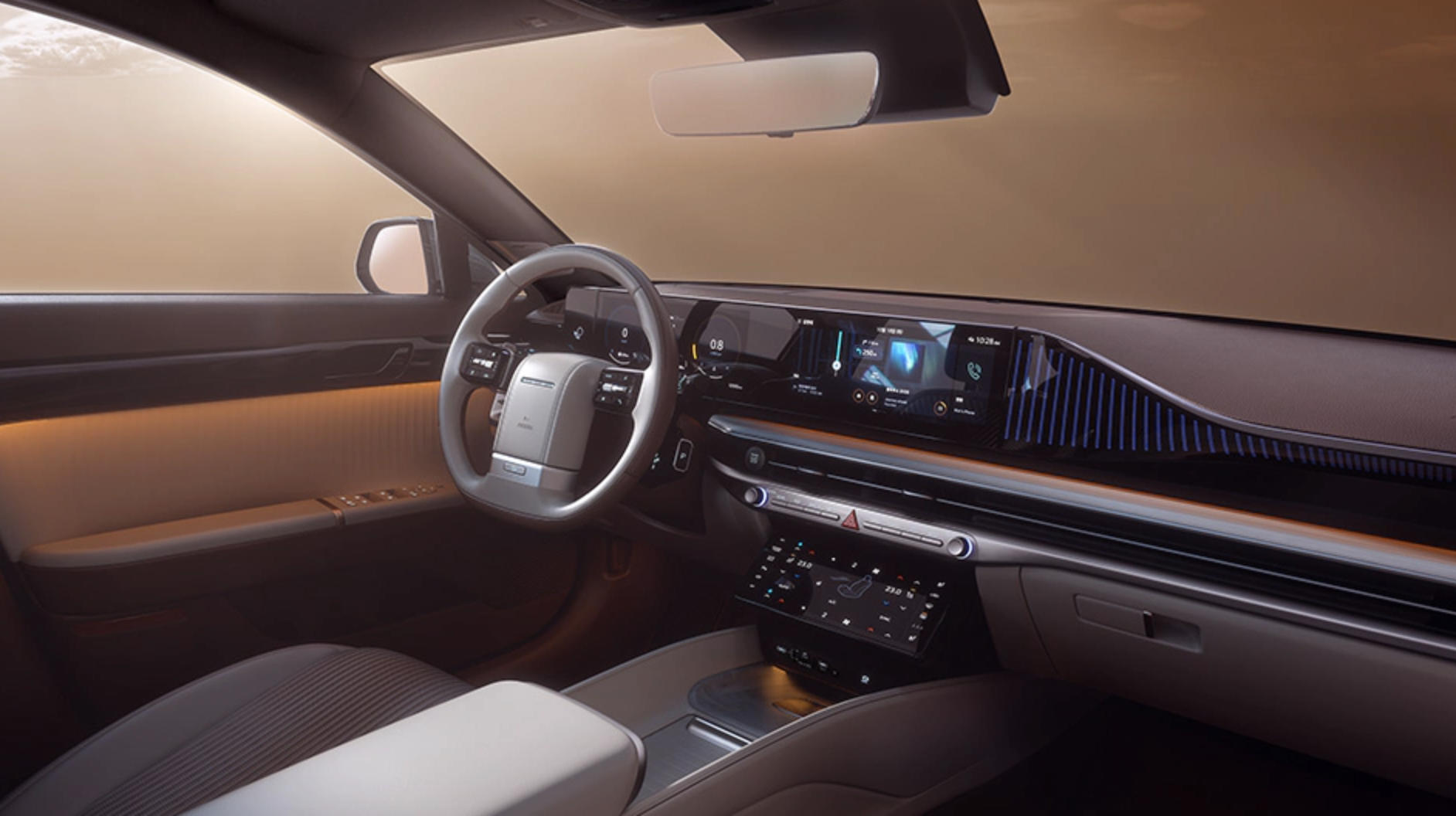 80년대 그랜저 1세대를 통해 선보인 실내공간을 보다 입체적인 비주얼로 디자인 했으며 도어트림과 대시보드의 전면부를 가로지르며 은은하게 퍼져 나가는 앰비언트 무드램프와 섬세하고 한국적인 느낌으로 재해석하여 디자인된 도어트림의 패턴 디테일과 함께 탑승객에게 보다 편안한 휴식 경험을 제공하고 있습니다.