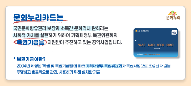 지원하는 카드입니다. (2022년에는 1인당 연간 11만 원 지원) - 문화누리카드는 기획재정부 복권위원회의 복권기금을 지원받아 추진하고 있는 공익사업입니다.