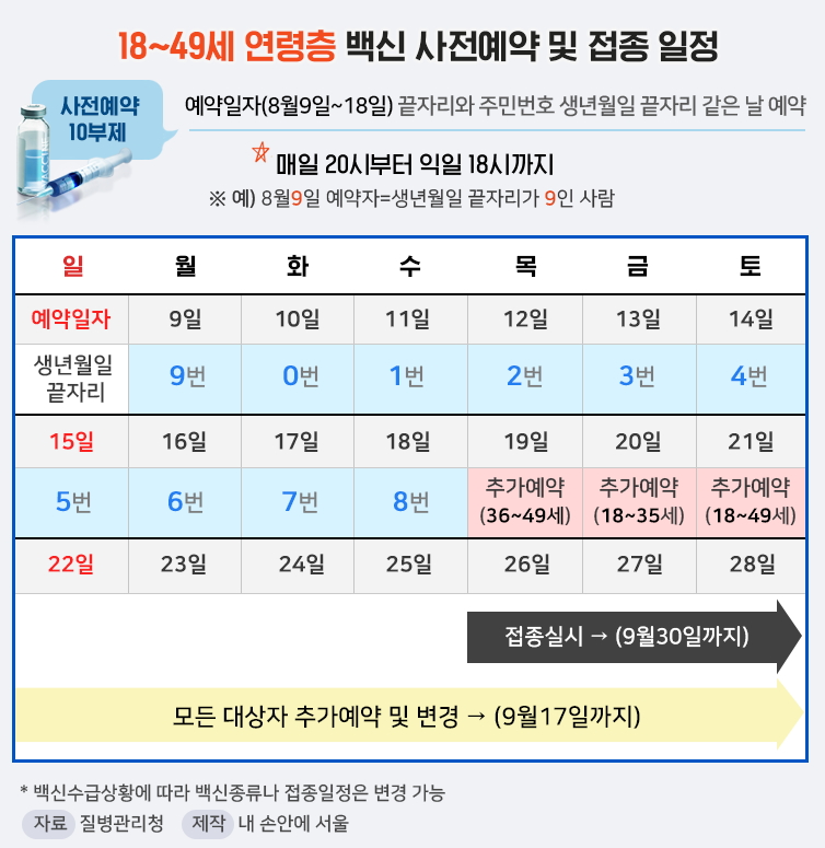 18~49세 연령층의 접종은 8월 26일부터 9월 30일까지 시행되며, mRNA 백신(화이자 또는 모더나)을 통해 위탁의료기관 또는 예방접종센터 중 본인이 희망한 기관에서 접종받을 수 있습니다.