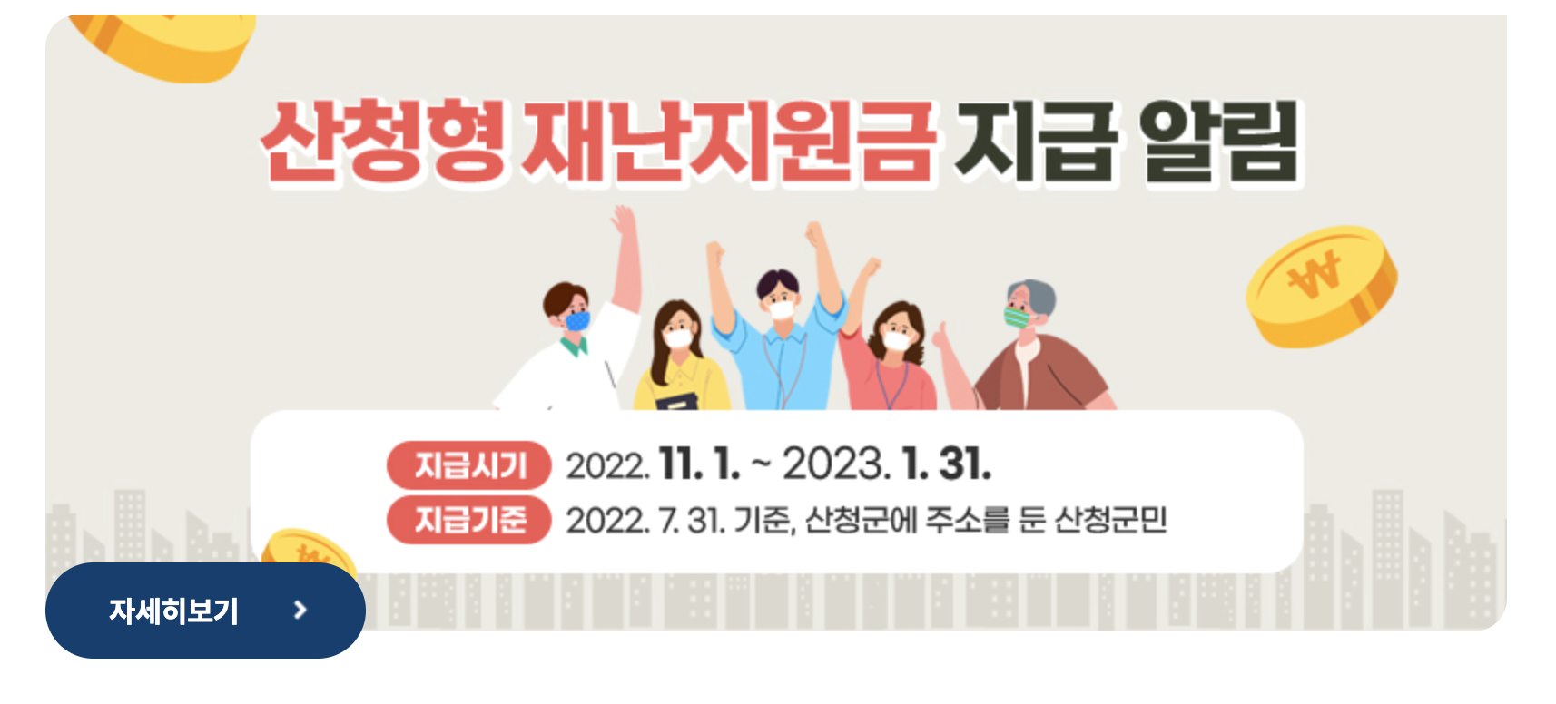 - 📍산청군 재난지원금 대상자는 2022년 7월 31일 이전에 산청군에 주민등록 주소를 둔(등본상) 산청군민이라면 누구나 지원금 20만원을 받을 수 있습니다.