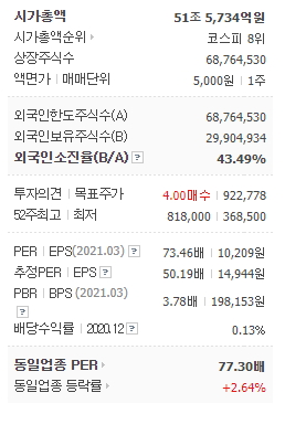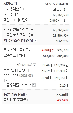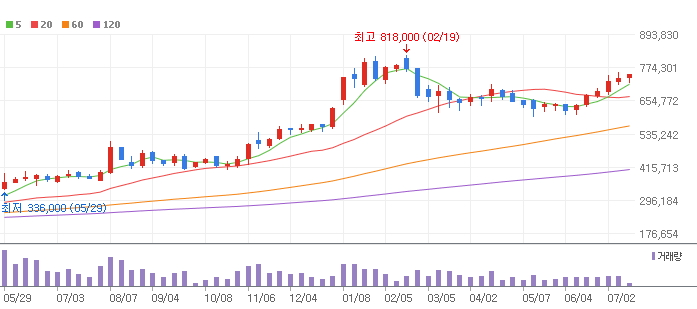 위 삼성SDI 주식 차트 중 주봉을 보시면 작년 5월 최저점 336,000원, 얼마 지나지 않은 올해 2월 818,000원으로 최 고점을 찍었습니다. 7월 13일 기준 750,000원 대로 2.74%나 상승한 하면서 기대감을 키웠는데요 외국인 소진율도 괜찮고 삼성SDI는 앞으로 2차 전지 대장주로 장기 투자로 가져가는 게 좋다는 전문가들의 의견이 중론입니다.