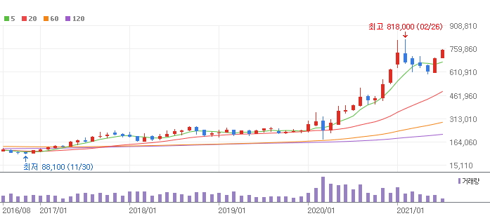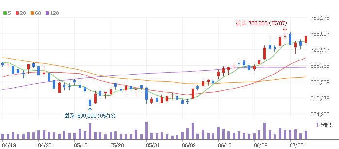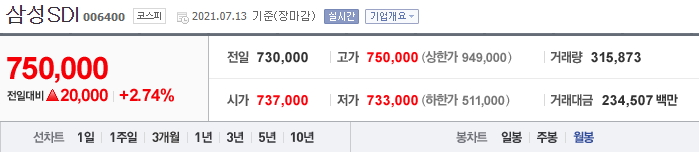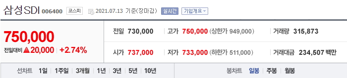 위 삼성SDI 주식 차트 중 주봉을 보시면 작년 5월 최저점 336,000원, 얼마 지나지 않은 올해 2월 818,000원으로 최 고점을 찍었습니다. 7월 13일 기준 750,000원 대로 2.74%나 상승한 하면서 기대감을 키웠는데요 외국인 소진율도 괜찮고 삼성SDI는 앞으로 2차 전지 대장주로 장기 투자로 가져가는 게 좋다는 전문가들의 의견이 중론입니다.