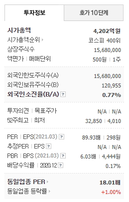 해당 부분만 보더라도 정치테마주 편입에 따른 상승세라는 의견이 우세합니다. 따라서 기업의 가치 보다는 윤석열 테마주로 엮인 게 주가 상상의 원인이라는 것을 감안하고 단기적인 등락 이슈에 대비해서 투자할 필요가 있어 보입니다.
