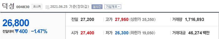 덕성은 실제로 매출과 당기순이익이 모두 오르는 구조를 보입니다. 하지만 최근 1년간의 차트를 보면 최저점 2,500원대에서 최고점인 30,000원대까지 올라간 것을 볼 수 있습니다.