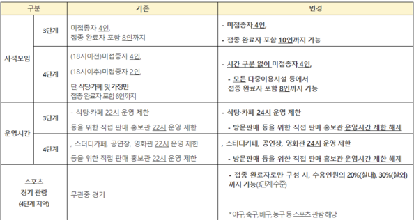 - 3단계 지역: 전체 수용 인원 20%까지, 접종 완료자만 있을 때 30%까지 가능