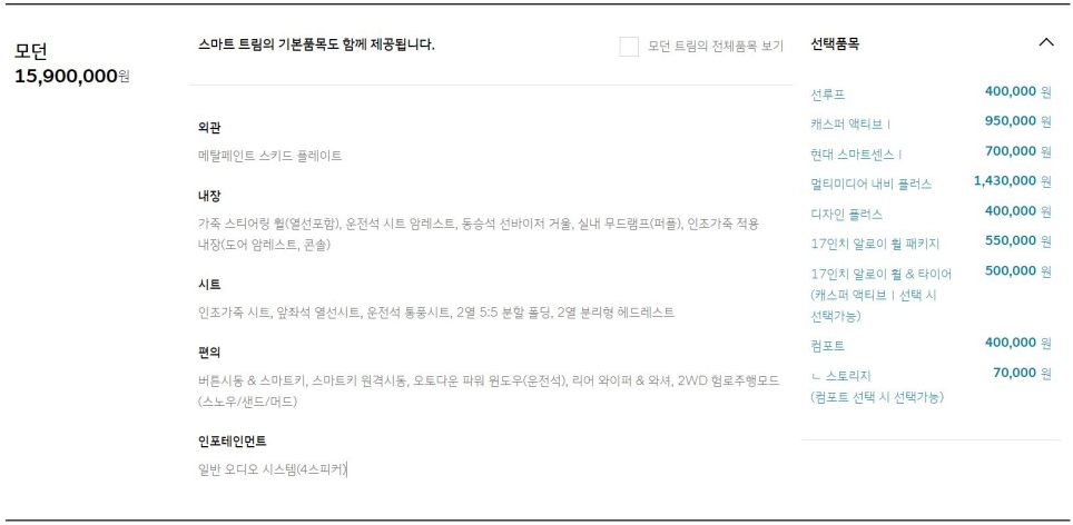 모던 트림은 1590만원 부터 시작합니다. 인조가죽시트, 가죽 스티어링 휠(열선내장), 앞 좌석 열선, 운전석 통풍시트, 2열 분할 폴딩시트가 포함됩니다. 이 옵션들은 스마트 트림에는 옵션으로 추가 자체가 안되기 때문에 위 옵션이 꼭 필요하다면 모던 트림으로 선택해야 합니다.