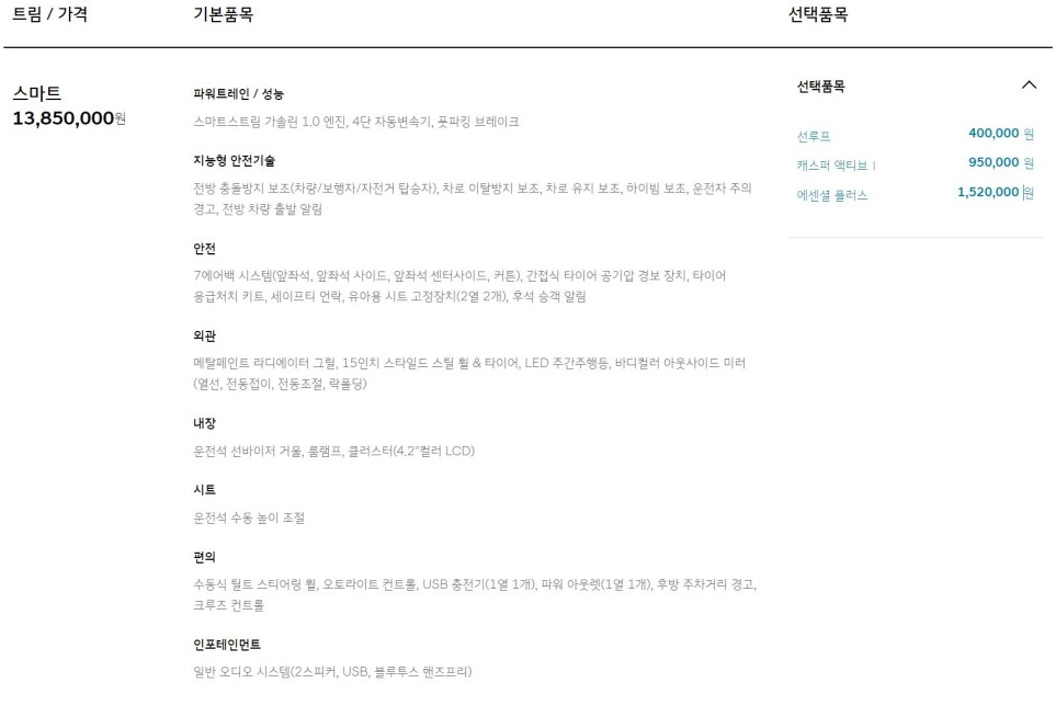 현대 캐스퍼 동호회나 커뮤니티를 살펴본 결과 스마트 트림에서는 에센셜 플러스 옵션(152만원) 추가해서 1537만원으로 출고하시는 걸 많이 추천하고 있는 추세입니다. 스마트 트림이 가성비에 중점을 둔 만큼 터보 엔진까지.. 맞지 않는다는 의견도 있었습니다.