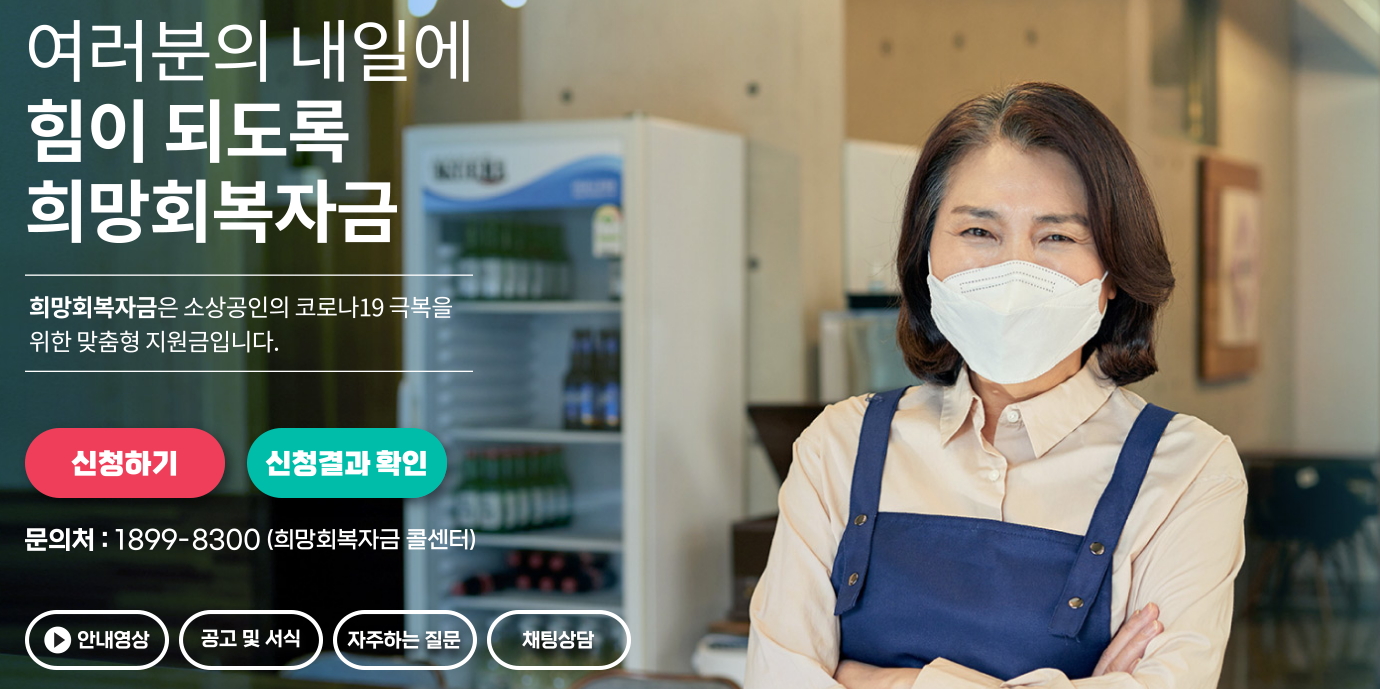 신종 코로나바이러스 감염증(코로나19) 피해 소상공인을 지원하기 위한 '희망회복자금'(5차 재난지원금)이 오늘 8월 17일부터 신청접수 되며 지급되고 있습니다.