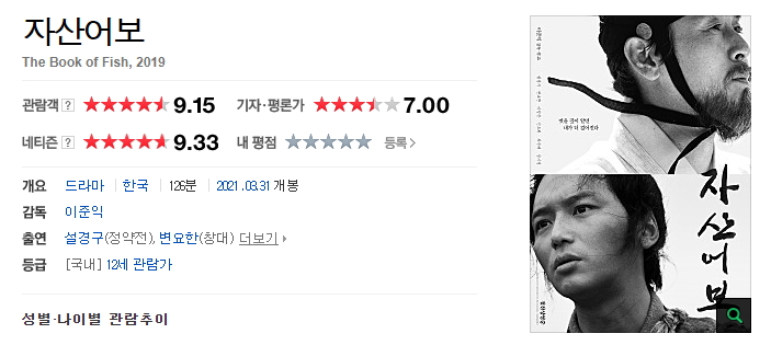 9/21(수) 오후 10:10 SBS에서 방영 예정인 추석 특선영화 자산어보 입니다.