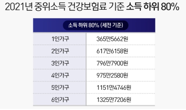 2021년 중위소득 건강보험료 기준 소득 하위 80%(세전 기준)